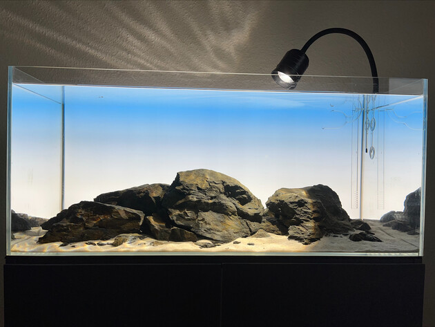Apply the film to the outside wall of the tank and then hang the Lightground screen.